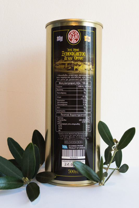 Zur Zeit AusverkauftNatives Olivenöl extra Premium Qualität, Ernte 2024 – Kloster Xenophontos 0,5 l